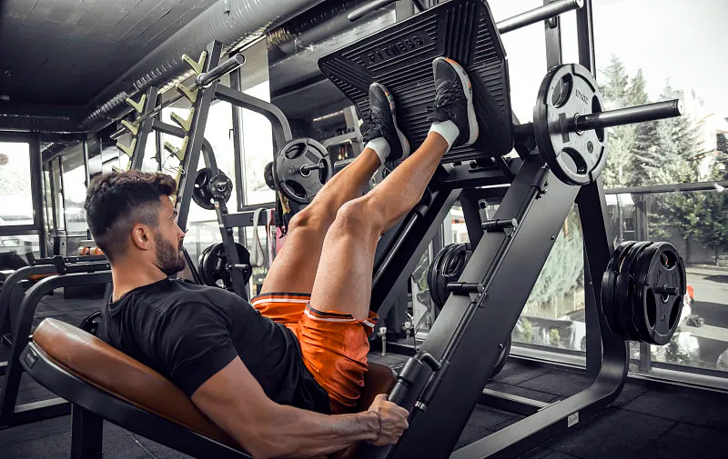 2. 45度倒蹬機:主要用于鍛煉腿部、背部和臀部的肌肉力量。這種倒蹬機的設計特點是其斜度為45度,并且具有固定的運動軌跡。用戶在使用時,可以將腳放在踏板上,通過腿部用力蹬踏來進行訓練。