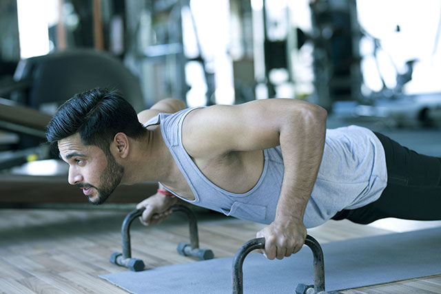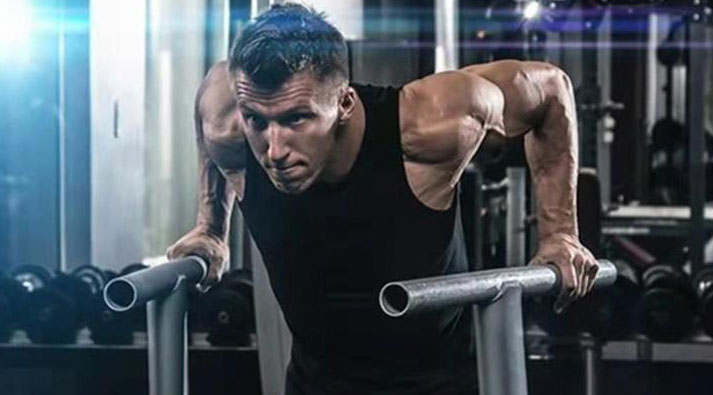 用寬距握俯臥撐架做俯臥撐動作,能使肩部下沉更深,能鍛煉到三角肌的前束和中束部位。