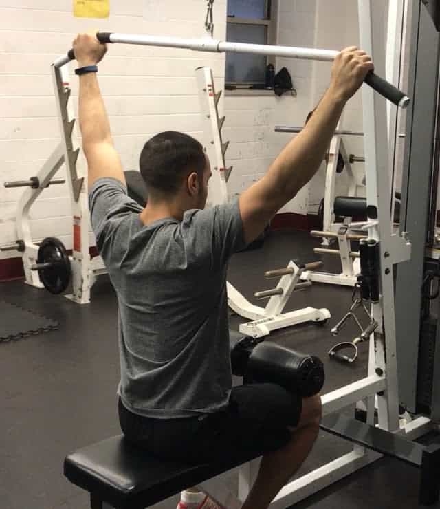 用史密斯架做寬距推伸動作,能鍛煉三角肌的前束部位。