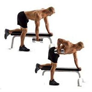 單手啞鈴劃船,可以使用平凳輔助,保持身體穩(wěn)定,單膝跪在凳子上和一側(cè)手臂支撐,另一手持啞鈴,吸氣伸展放下充分拉伸背部,呼氣發(fā)力拉起啞鈴,手臂盡量貼住身體,將啞鈴拉至肋下。