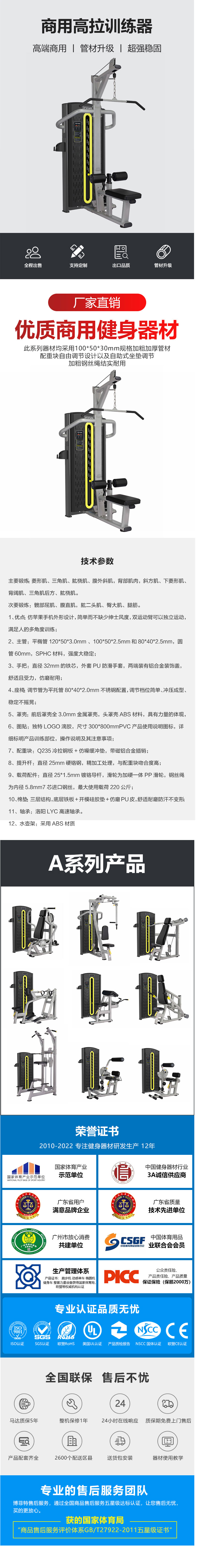 9、載荷配件:直徑25*1.5mm鍍鉻導(dǎo)桿,滑輪為加硬一體PP滑輪,鋼絲繩為內(nèi)徑5.8mm7芯進(jìn)口鋼絲,最大使用載荷220公斤;