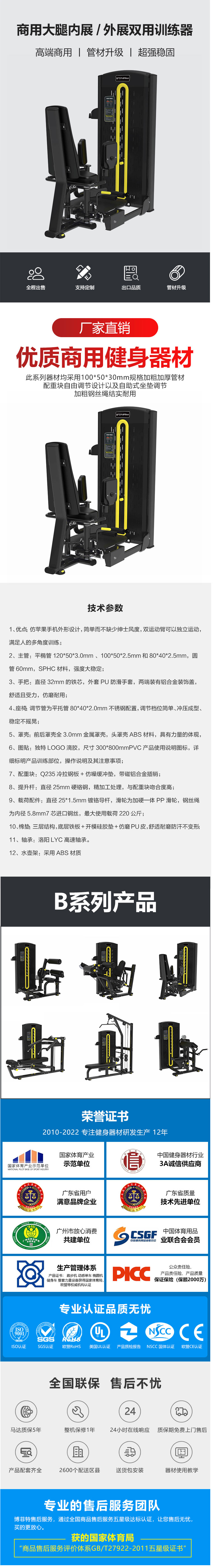 9、載荷配件:直徑25*1.5mm鍍鉻導桿,滑輪為加硬一體PP滑輪,鋼絲繩為內徑5.8mm7芯進口鋼絲,最大使用載荷220公斤;